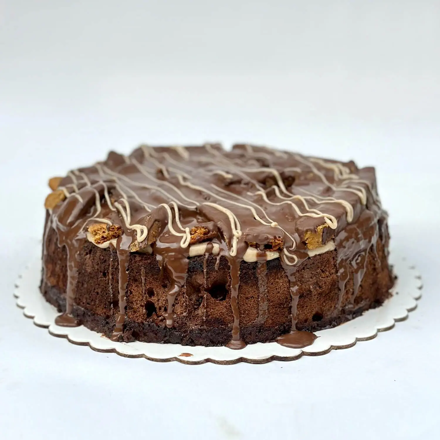 Pastel hecho a base de nuestro brownie proteico, con una capa de nutella dulce de leche y crujientes trozos de bi-sheip o cookie proteico cubierto de chocolate bitter sin azucar y decorados con lineas de nutella dulce de leche.
